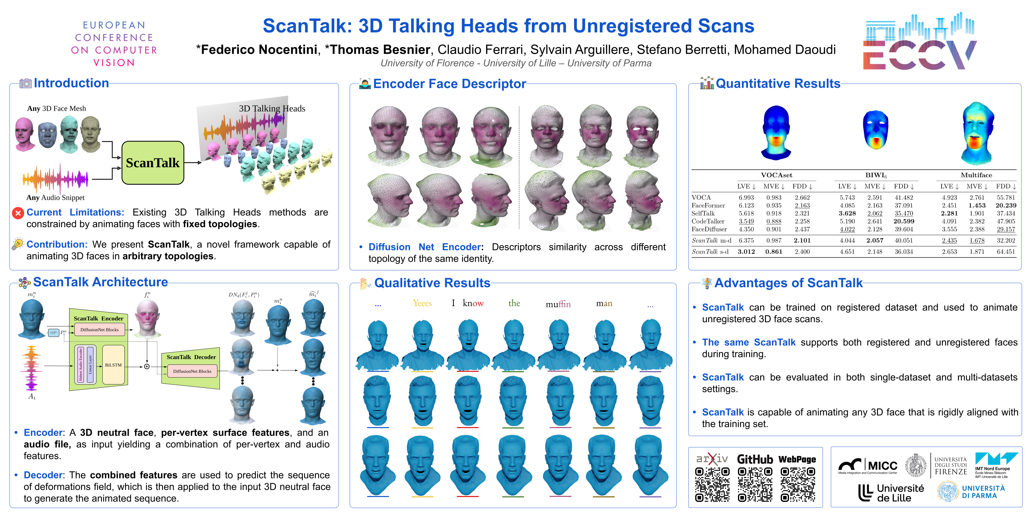 Speech-driven 3D talking heads generation has emerged as a significant area of interest among researchers, presenting numerous challenges. Existing methods are constrained by animating faces with fixed topologies, wherein point-wise correspondence is established, and the number and order of points remains consistent across all identities the model can animate. In this work, we present ScanTalk, a novel framework capable of animating 3D faces in arbitrary topologies including scanned data. Our approach relies on the DiffusionNet architecture to overcome the fixed topology constraint, offering promising avenues for more flexible and realistic 3D animations. By leveraging the power of DiffusionNet, ScanTalk not only adapts to diverse facial structures but also maintains fidelity when dealing with scanned data, thereby enhancing the authenticity and versatility of generated 3D talking heads. Through comprehensive comparisons with state-of-the-art methods, we validate the efficacy of our approach, demonstrating its capacity to generate realistic talking heads comparable to existing techniques. While our primary objective is to develop a generic method free from topological constraints, all state-of-the-art methodologies are bound by such limitations. Code for reproducing our results, and the pre-trained model will be made available.